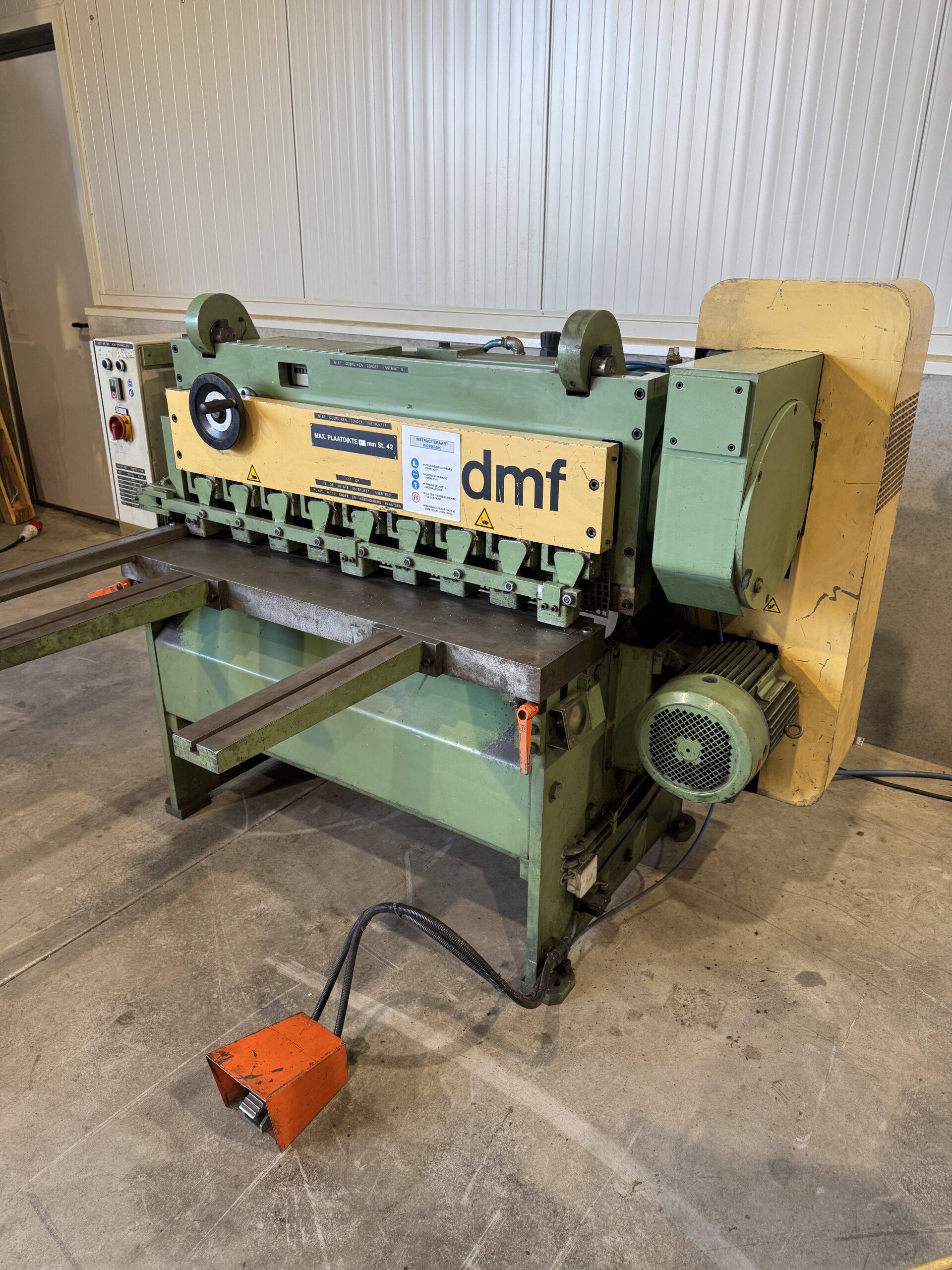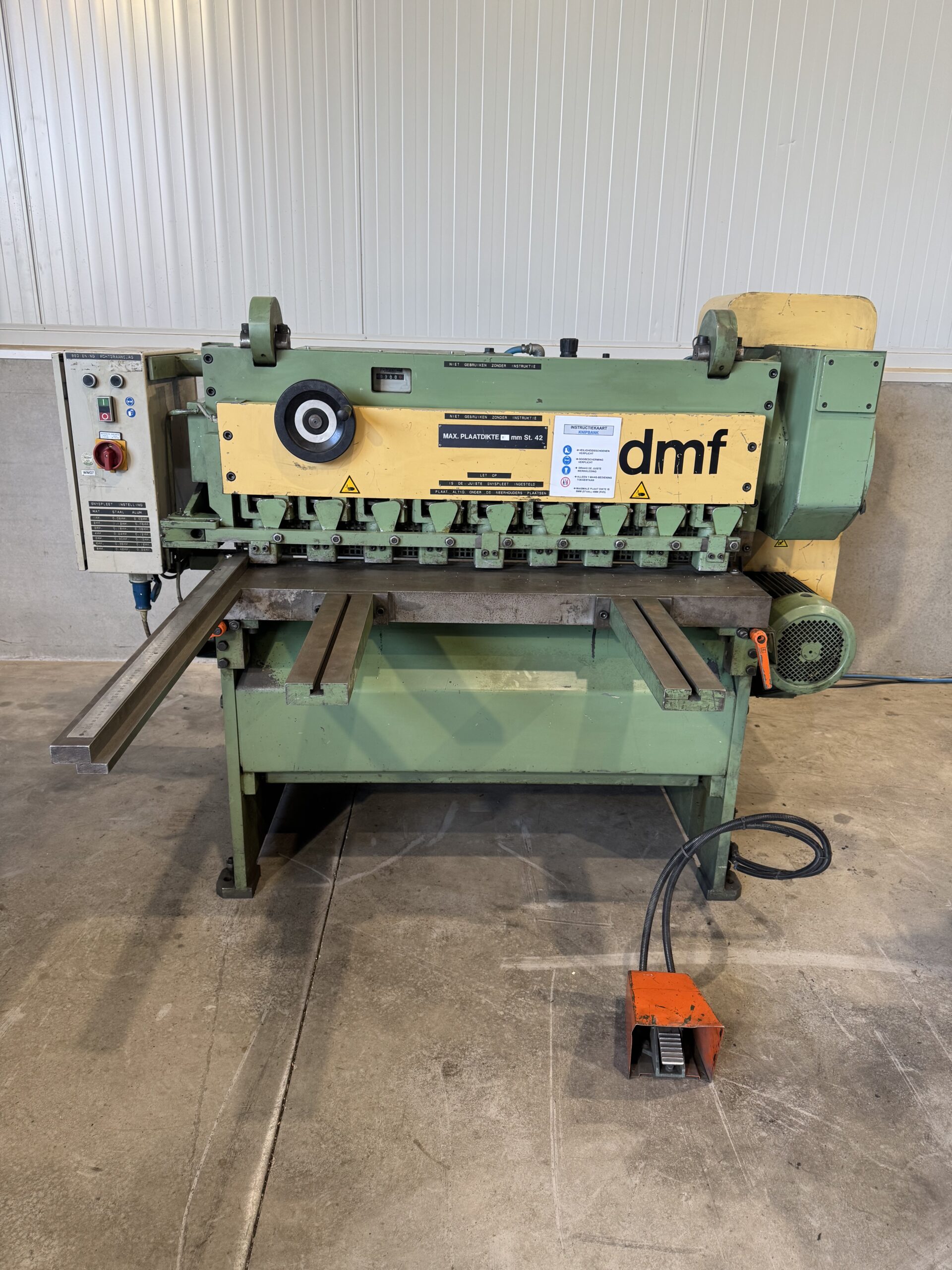 DMF 8G 110 knipschaar / plaatschaar in nette staat. Deze machine kan platen knippen tot 1100 mm breed en met een dikte tot 8 mm. Voorzien van een elektrische aanslag voor nauwkeurig werken.